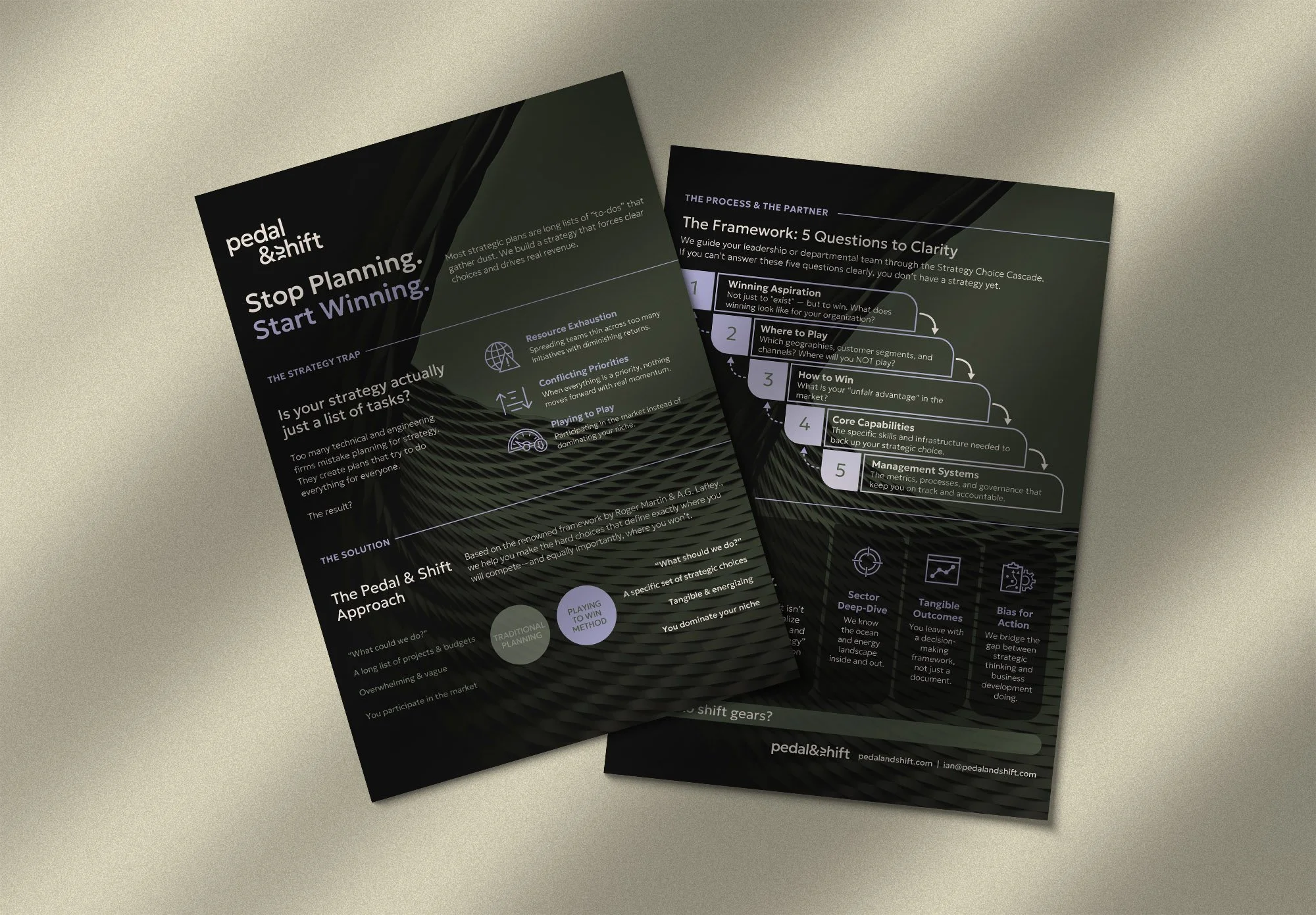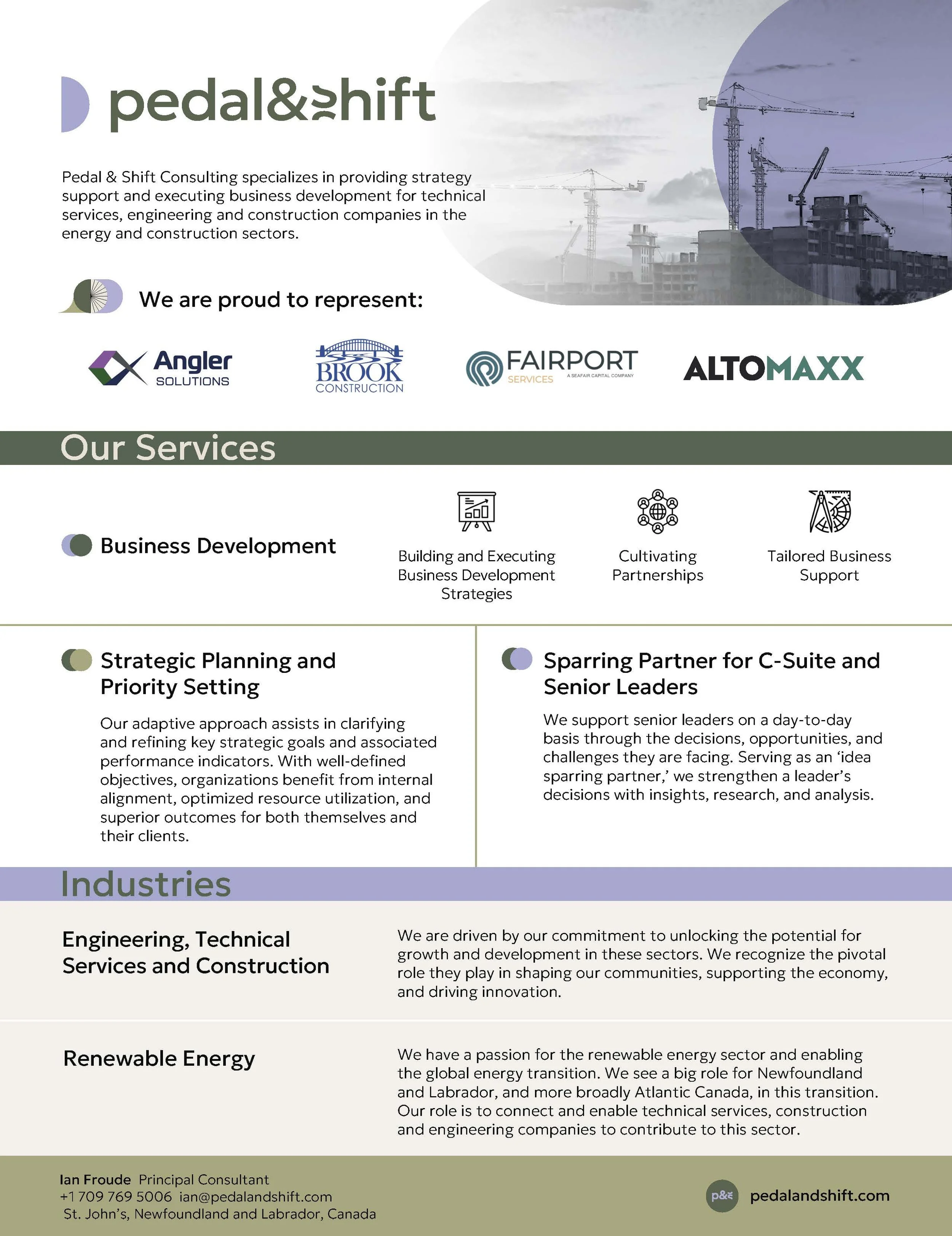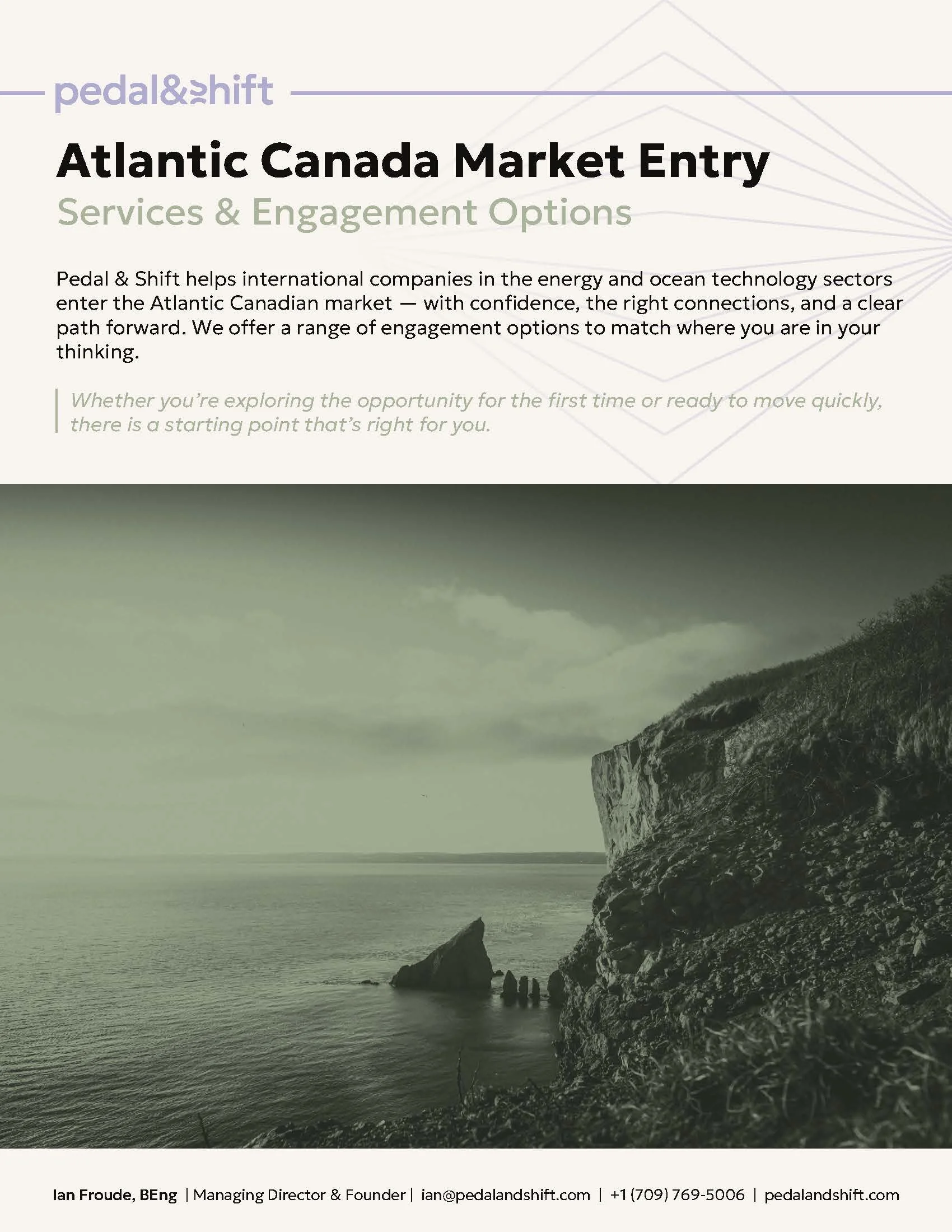 Pedal & Shift is a business development consultancy based in St. John's, helping technical service companies grow in the ocean tech and renewable energy sectors — across Atlantic Canada and into European markets. I reached out cold in April 2024, and what started as a single conversation turned into an ongoing hourly engagement. Since then, I've become their go-to designer for both P&S's own marketing materials and the design deliverables they provide to their clients.